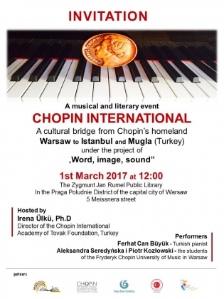 Türkiye Toplum Hizmetleri Vakfı (TOVAK) 'na bağlı Chopin Uluslararası Akademisi olarak , Chopin'in doğum günü 1 Mart 2017 tarihinde Chopin'in doğum yeri Varşova da kutluyoruz. Ayrıca "Kelime, Görüntü, Ses projesi kapsamında İstanbul ve Muğla ile kültür köprüsü oluşturuyoruz. Etkinlikte Türkiyeden Ferhat Can Büyük, Polonyada Aleksandra Seredñska ve Piotr Kozlowski konser verecektir.